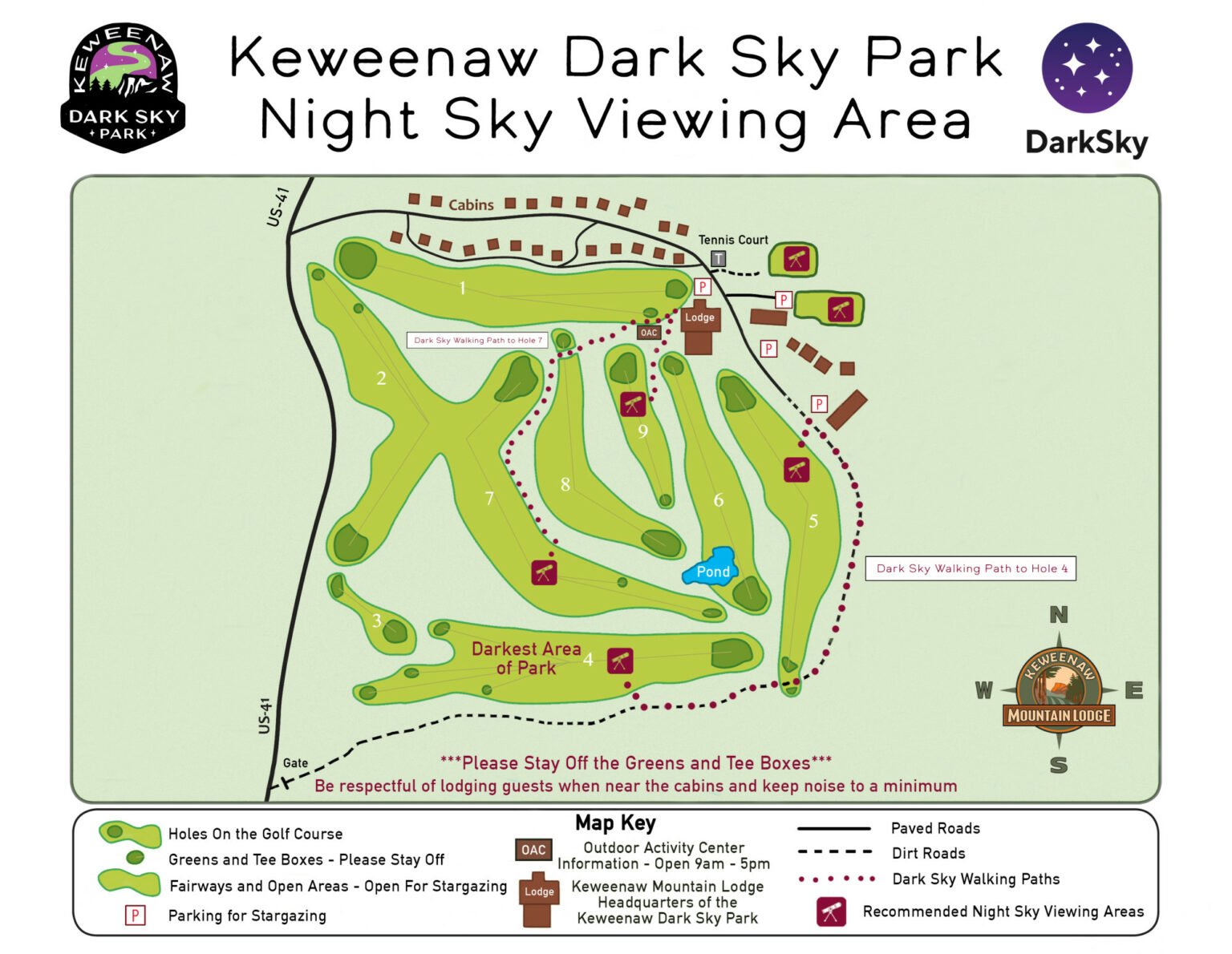 Below are maps of desired areas where you can venture around the property and at the top of the Keweenaw — with the Lodge complex (main building and Outdoor Activity Center) being the stargazing headquarters.